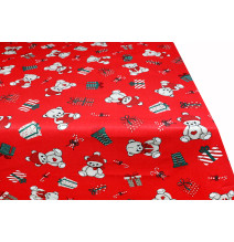 Karácsonyi pamut terítő mackók, ajándékok és cukorkák piros alapon