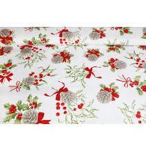Karácsonyi párnahuzat fenyőtobozokkal, magyallal és piros masnikkal