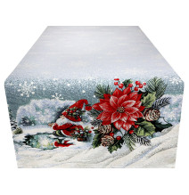 Varázsoljon varázslatos téli hangulatot otthonában ezzel a gyönyörű karácsonyi gobelin terítővel. Gyönyörű motívum egy lurexszel díszített, hosszú, piros kalapban lévő karácsonyi manóról, amint egy befagyott tavon korcsolyázik egy havas táj közepén. A lágy téli árnyalatok és a piros részletek kombinációja egyszerre elegáns és játékos.